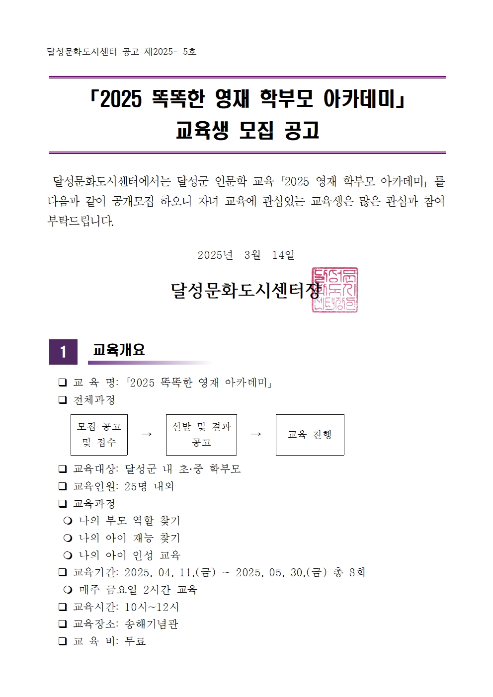 2025「달성맘의 품」영재 학부모 아카데미 교육생 모집 공고