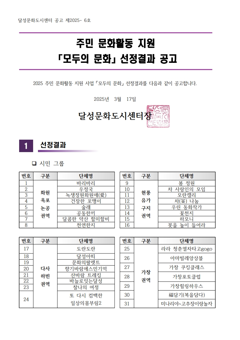 2025 주민 문화활동 지원 「모두의 문화」 선정결과 공고